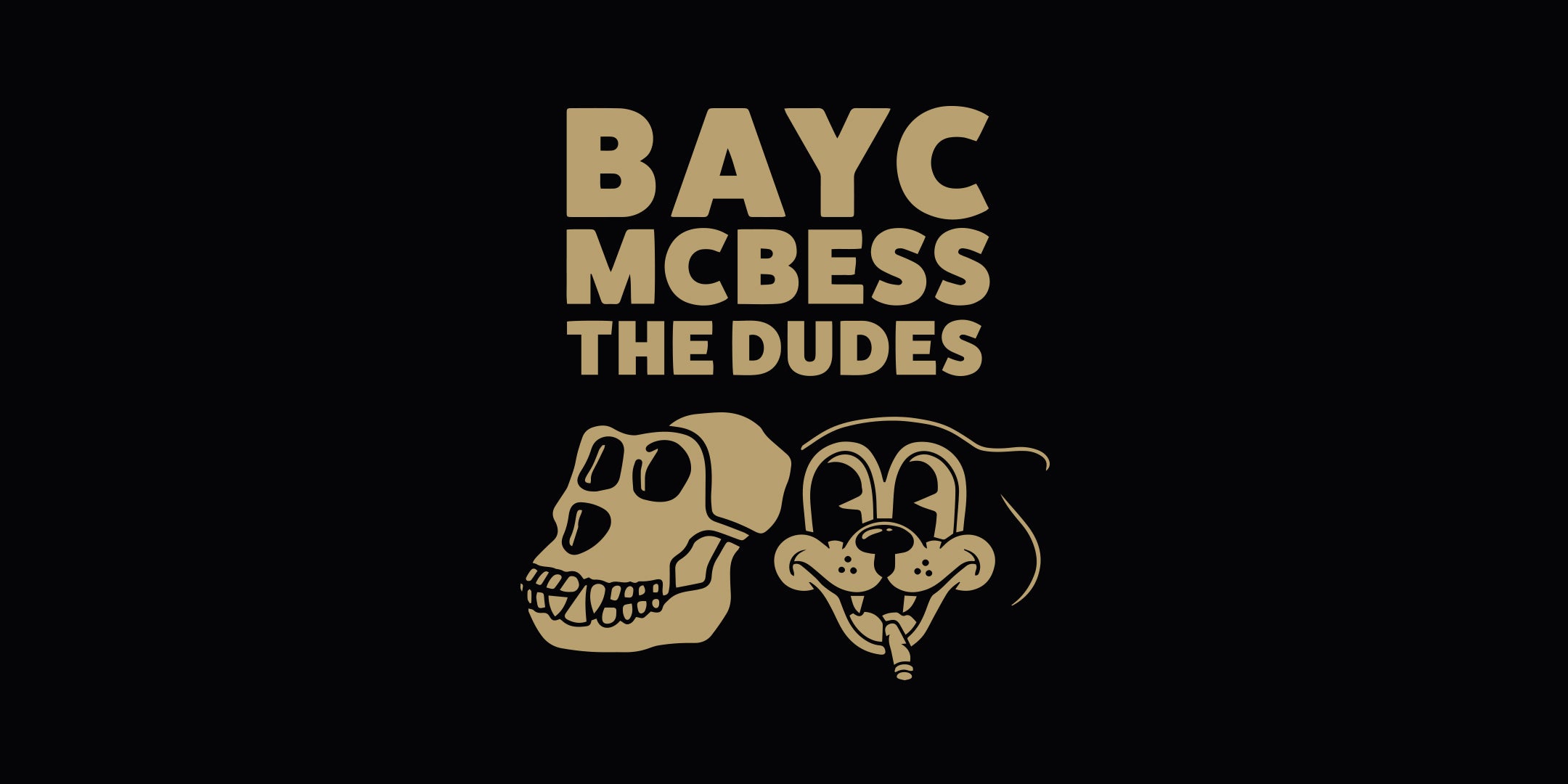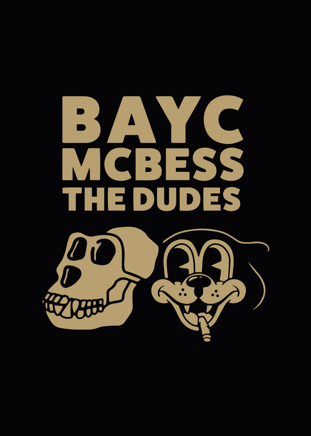 The mcbess x BAYC x The Dudes collaboration is a limited edition capsule collection featuring large format screen prints, t-shirts, stickers, pins and a denim jacket, designed by mcbess and produced by The Dudes. All the pieces in the collection are of course themed around the off-beat world of Bored Ape Yacht Club, reimagined by mcbess.